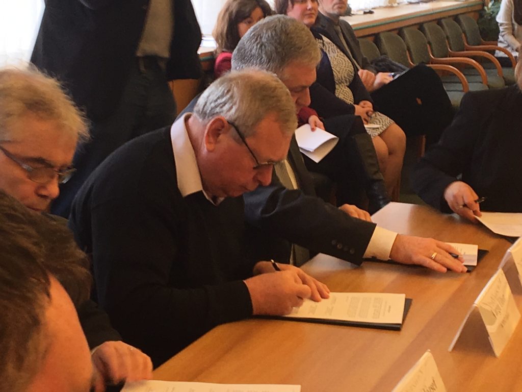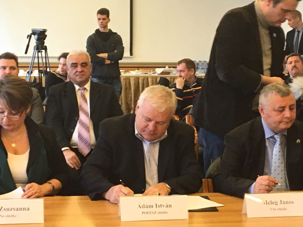 Ádám István, a POFÉSZ elnöke aláírja a megállapodást